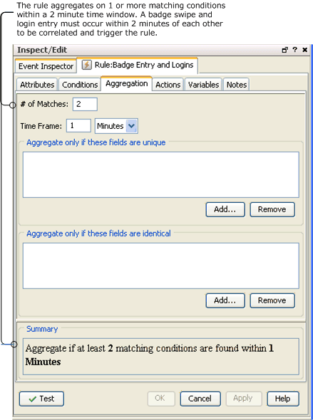 This rule sets an aggregation time window to correlate these events at 2 minutes. This means that a login event (end time) must occur within 2 minutes of a badge swipe event (end time) in order for the rule to be triggered.