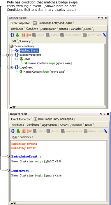This example applies to standard rules. The following shows the conditions statements for a rule that correlates Badge swipe events that are sent to the Manager in a batch file once per day; with login events that are sent to the Manager frequently in real-time. The example rule looks for an event with “swipe” in the name and an event with “login” in the name.