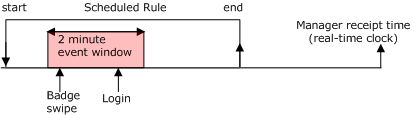 Note that if you deploy this rule in real-time rules, the rule is not triggered to capture the events you want to correlate. Although the badge swipe events are actually occurring within 2 minutes of login events (according to event end times), the Manager Receipt Time for badge swipe events is always hours later (whenever they are submitted as batched events). In this kind of scenario, the real-time rules engine would never correlate these events because the badge swipe events (with late Manager Receipt time) would be read in so much later.