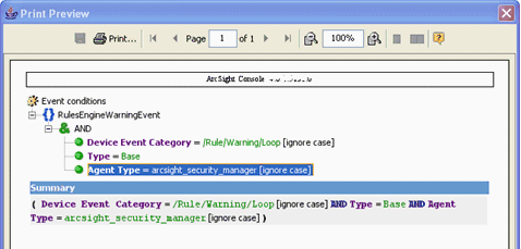 The system displays a preview of the printout. For example, here is a Print Preview of the filter for a rule.