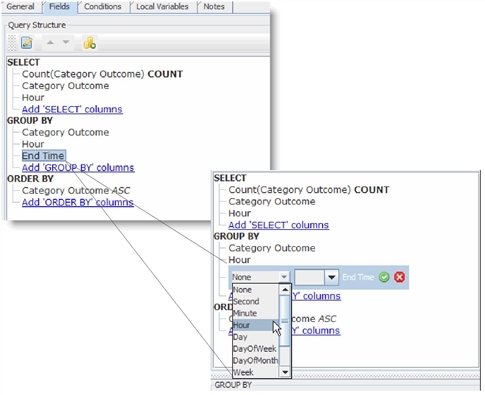 To specify a function for GROUP BY column data, double-click a field or variable in the top pane under “GROUP BY” and select one of the available time-based functions (from the drop-down menu) to apply to the column data.