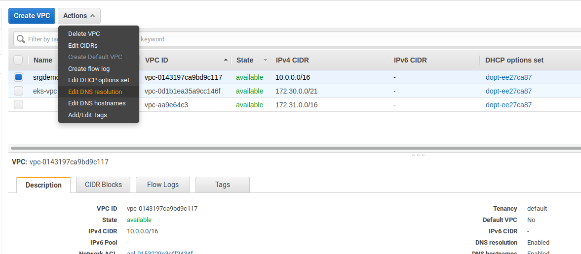 - Select the check box corresponding to your VPC. Then, under , select Edit DNS resolution.