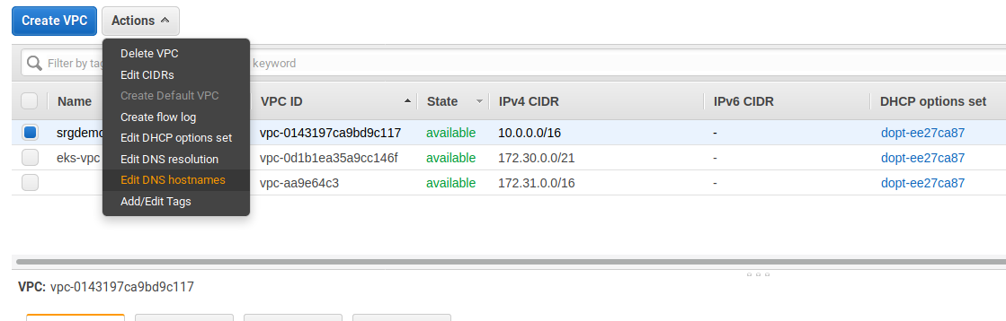 - Select the check box corresponding to your VPC. Then, under , select Edit DNS hostnames.