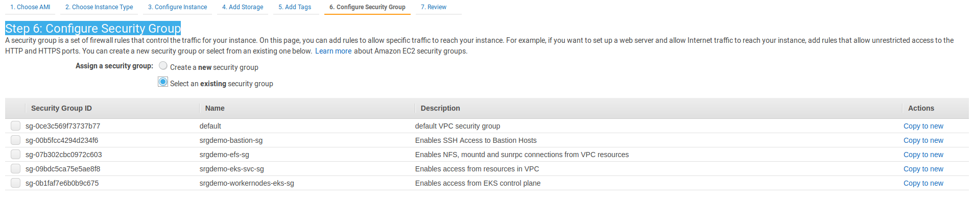 - On the Step 6: Configure Security Group page, under Assign a security group, choose Select an existing security group.