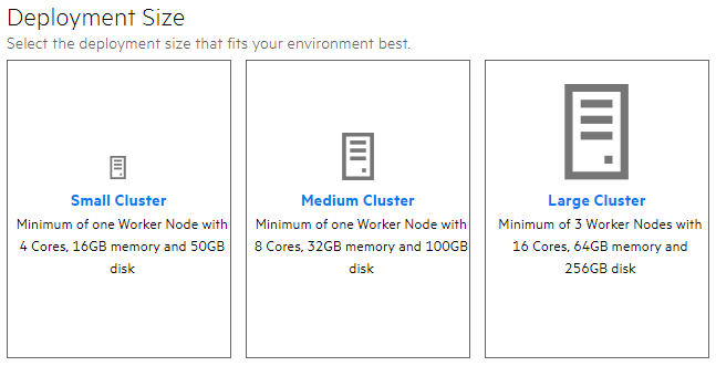 The installation will be halted if your environment does not meet the minimal hardware requirements for the deployment.Size Minimum Worker Nodes Cores Memory Disk Small Cluster 1 Worker Node 4 Cores 16 GB 50 GB Medium Cluster 1 Worker Node 8 Cores 32 GB 100 GB Large Cluster 3 Worker Nodes 16 Cores 65 GB 256 GB