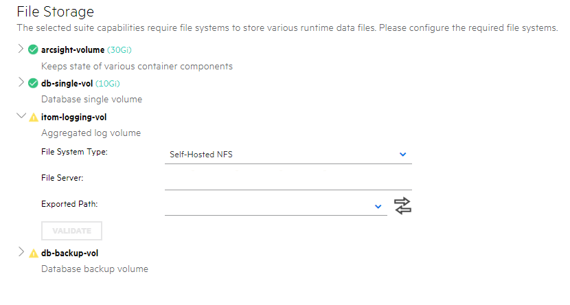 /nfs/arcsight-volume, /nfs/db-backup-vol, /nfs/db-single-vol, /nfs/itom-logging-vol itom-vol.) - Click Validate. All volumes must validate successfully to continue with the installation. The following volumes must be available on your NFS server.