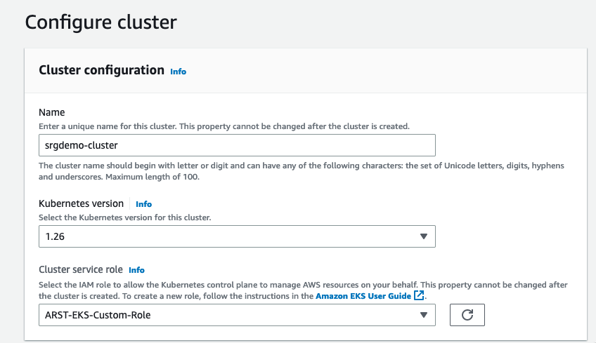 resources-vpc-config cannot contain spaces; it must be one string.<Kubernetes version>: Use the value from the AWS worksheet.