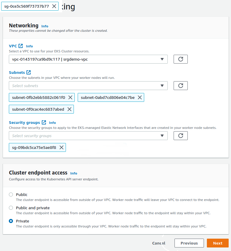 - Cluster endpoint access: Select Private to keep the cluster isolated.