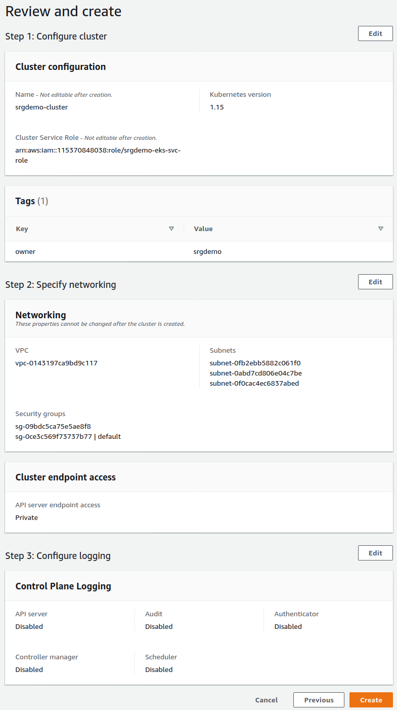 aws eks create-cluster \ --name srgdemo-cluster \ --role-arn arn:aws:iam::115370811111:role/srgdemo-eks-svc-role \ --resources-vpc-config subnetIds=subnet-0fb2ebb5882c061f0,subnet-0f0cac4ec6837abed,subnet-0abd7cd806e04c7be,\ endpointPublicAccess=false,endpointPrivateAccess=true,securityGroupIds=sg-09bdc5ca75e5ae8f8 \ --kubernetes-version 1.26