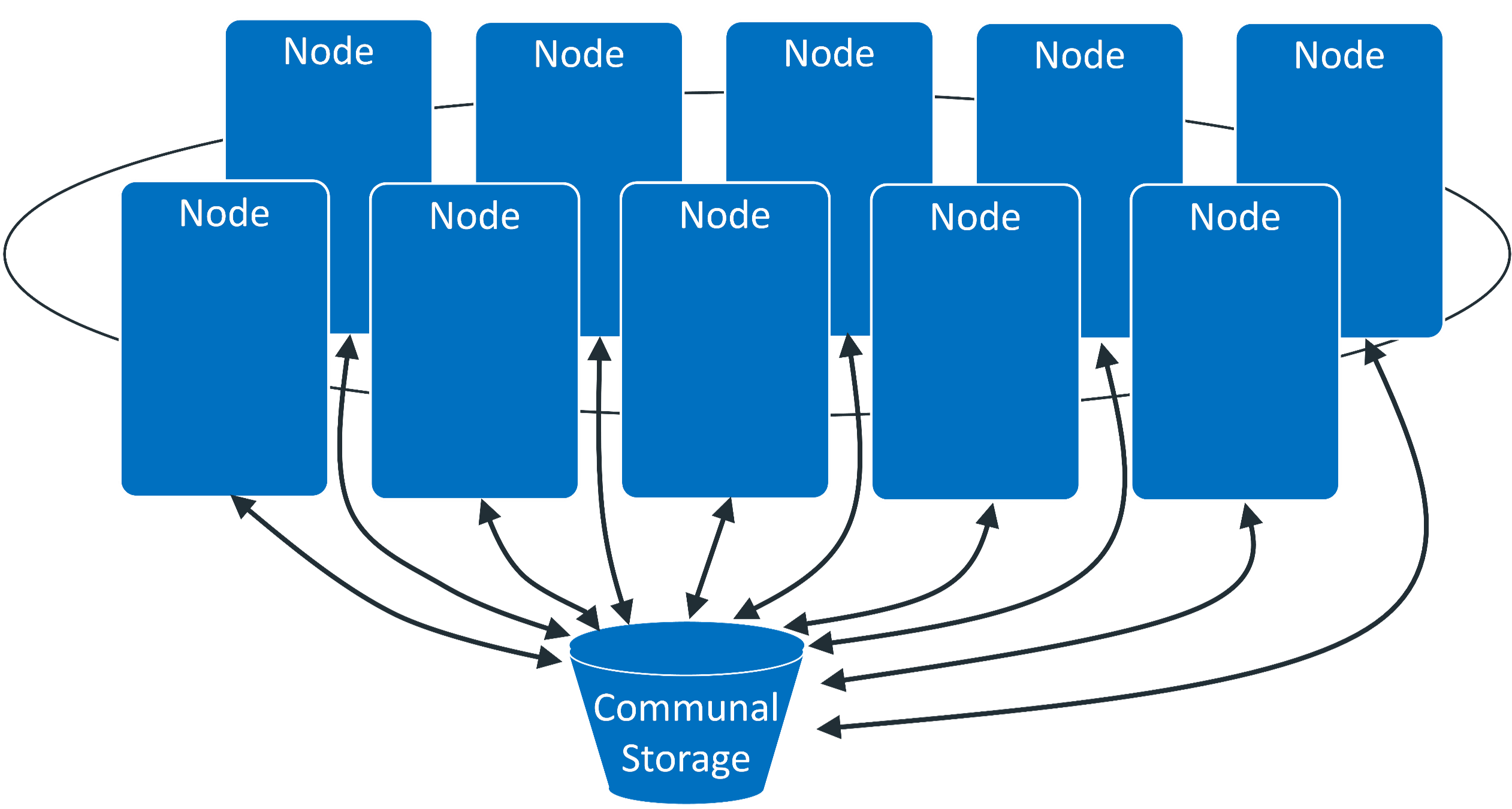 This shared storage model enables elasticity, meaning it is both time and cost-effective to adapt the cluster resources to fit the usage pattern of the cluster. If a node goes down, other nodes are not impacted because of shared storage. Node restarts are fast and no recovery is needed. Thus, you do not need to explicitly keep track of, or load/unload long-term event data. The Database can bring the data to the cache on demand automatically and then move the data out when not in use. To expand communal storage, you can purchase additional storage devices rather than purchasing additional CPU and memory.