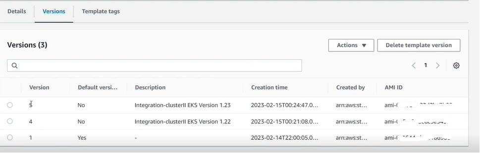 Click Actions > Modify template (Create new version) to create a copy of the selected configuration. It's helpful do add a description that includes the EKS version contained, so as to tell one version from the others easily.