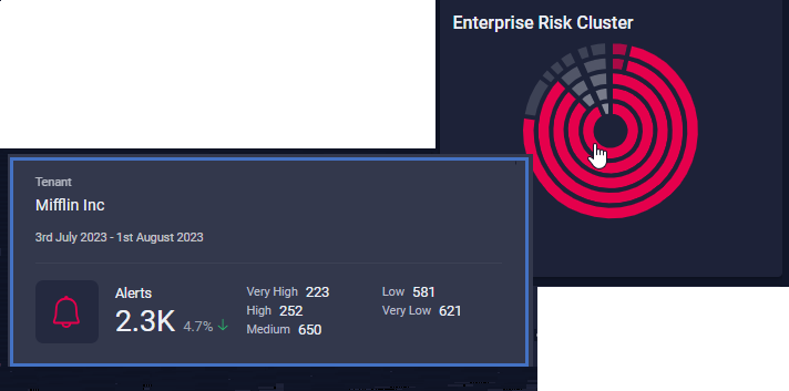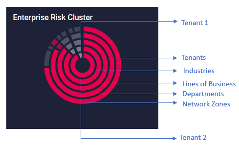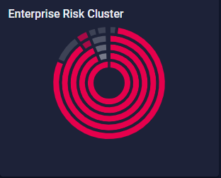 The Enterprise Risk Cluster widget in the CISO Overview optic displays the distribution of alerts across all entities in the environment. Each ring in the chart represents an entity with the innermost ring representing tenants and each subsequent ring representing entities in the following order tenants>industries>line of business>departments>network zones.