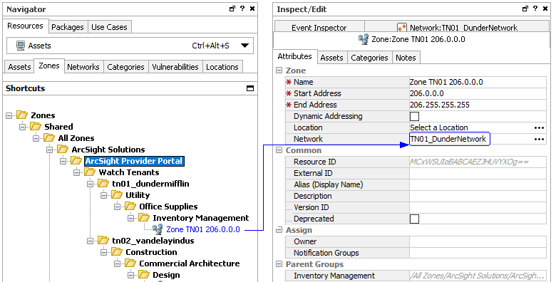 Network and zone model can be configured in ArcSight Enterprise Security Manager (ESM) or ArcSight Management Center (ArcMC).