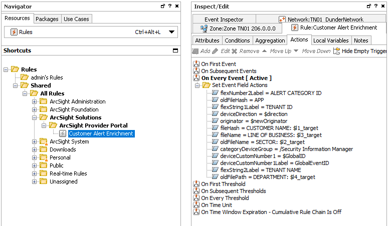 Ensure that the enabled rules are configured to populate and aggregate the correct fields required for ArcSight Platform. Refer to the sample content package for more information on how to set up the fields as shown in the following image: