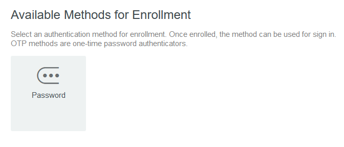 Before you set up your credentials, the default method for authenticating your account is Email One-Time Password (OTP), which sends an (OTP) code to your specified email address. When you log in, after you have configured additional credentials, you will be prompted to , which relates to the authentication method that you wish to use for that login session. The following steps show how to configure the authentication service to use the Password method instead of the OTP method for verifying your credentials.