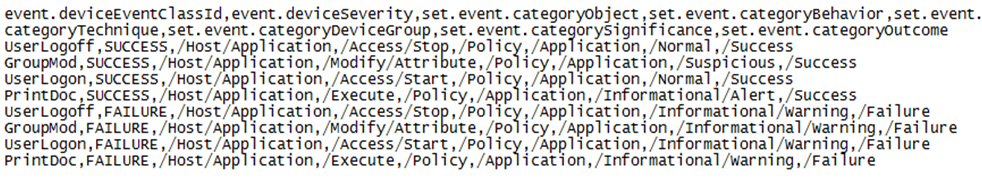 namespace.count=4 namespace[0].prefix=default namespace[0].uri=urn:arcsight:MF:event namespace[1].prefix=event namespace[1].uri=urn:arcsight:MF:event namespace[2].prefix=addn namespace[2].uri=urn:arcsight:MF:addn namespace[3].prefix=eventMain namespace[3].uri=urn:arcsight:MF:event:main # Tokenization Section trigger.node.expression=//EventHeader additionaldata.enabled=true token.count=25