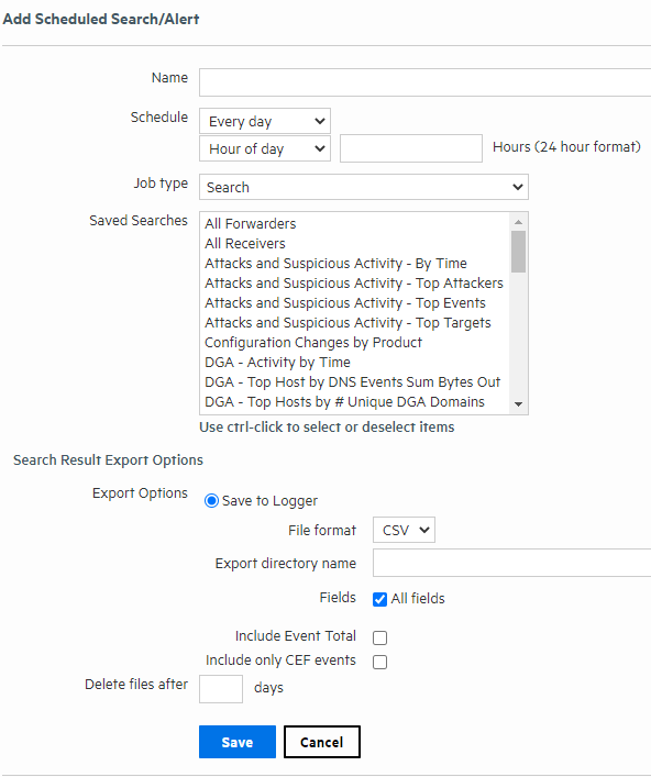 Select Search to schedule a Saved Search. Select Alert to schedule a Saved Search Alert. |
