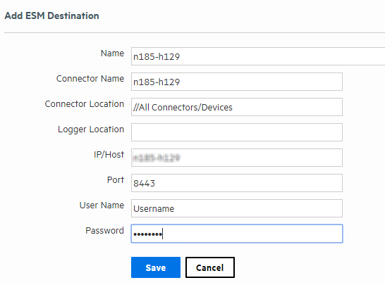 The ArcSight Manager to which the forwarder will direct events. Make sure the name or IP address you specify in this field is exactly the name or IP address configured on the ArcSight Manager. If the two names or IP addresses do not match, you will not be able to set up an ESM Destination successfully.