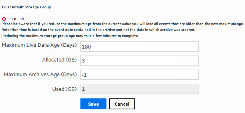 Note: If there is sufficient space to reduce the storage group size, you can change it without modifying the Maximum Age value (to modify the retention policy to delete data).