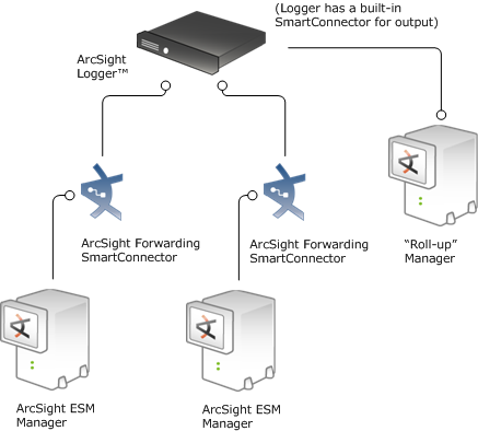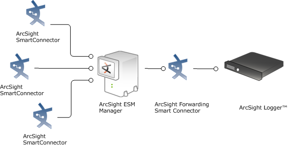 Logger also inter-operates with ESM as shown in the following figures. A typical use of Logger is to collect firewall or other data and forward a subset of the data to ArcSight Manager for real-time monitoring and correlation, as shown below. Logger can store the raw firewall data for compliance or service-level agreement purposes.