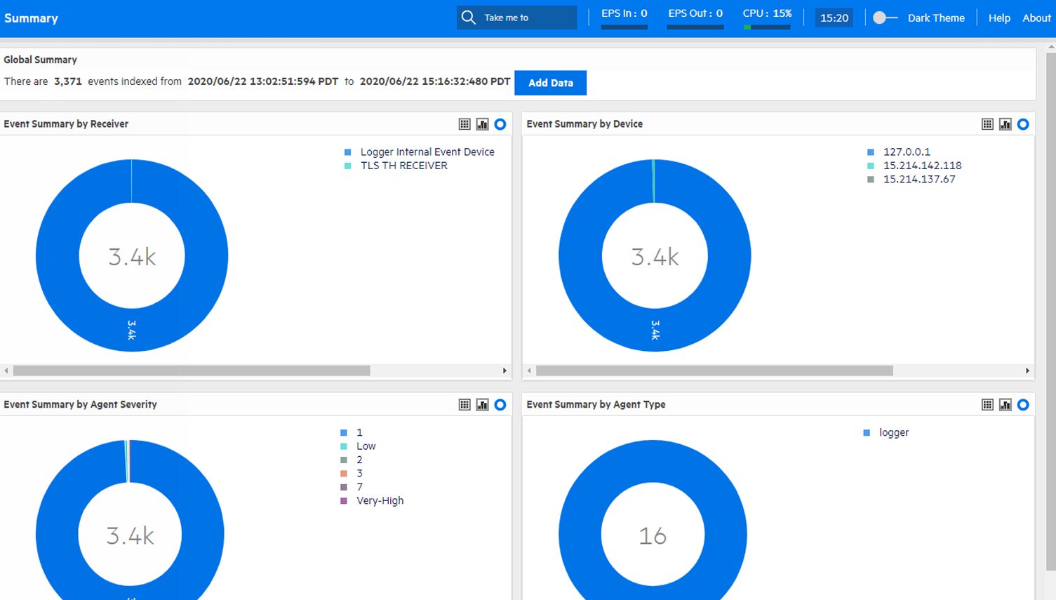- Global Summary: The number of events indexed on your Logger during the time period displayed on the screen. This time period is dependent on the retention policy set on your Logger. The start is the time of the oldest event stored in the Logger since the Logger was restarted, that has not aged out due to retention; the end time is current time. The Add Data (