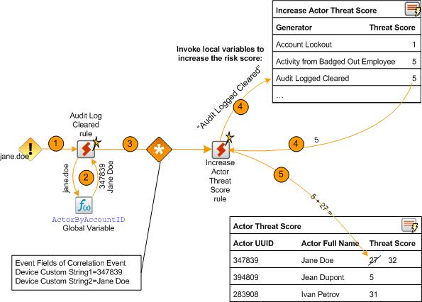 The Actor Threat Score use case provides a method for tracking the level of suspicious activity exhibited by monitored users. Analysts are notified when an actor's suspicious activity exceeds configurable levels. Actors with high threat scores are monitored at a higher level of scrutiny.