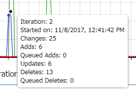 Charts track volume, changes, and errors. Each item is denoted by a specific colored line: