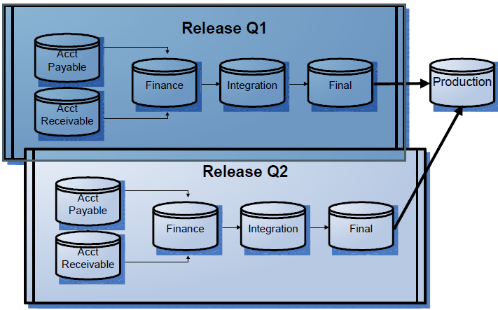 With a physical implementation of release management, parallel development takes place in the application libraries for each release. These changes are isolated from any other application’s or release’s changes.