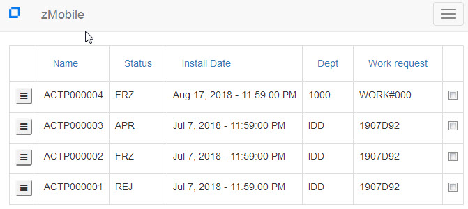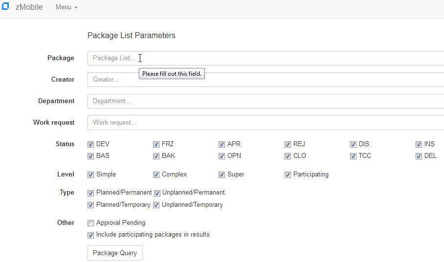 From the Home Page shown above, the ZMF Functions available are ’Approvals List’ and ’Package Query’. Select ’Approvals List’ to display all packages that have a pending approval indicator. If you select ’Package Query’ you will next be presented with a form to filter the list of packages displayed.