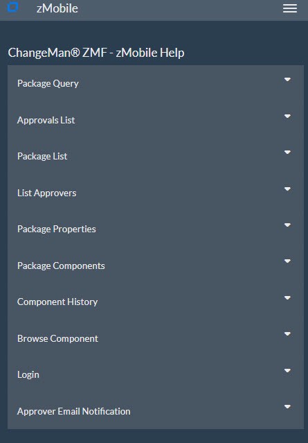 The last option on the Primary Menu, ’Help’, gives you a comprehensive help for zMobile with 10 sections, each of which can be expanded via the toggle button on the right of each section.