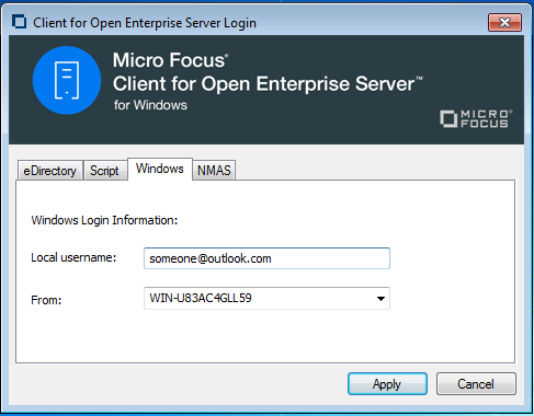 In the Login dialog, on the Windows tab, type the Windows Live ID in the Local username text box and then click Apply.