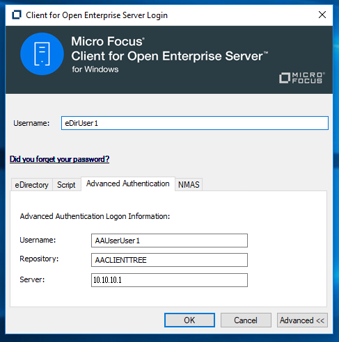 If Advanced Authentication Client is enabled to be used during eDirectory login, when a network login is attempted from the desktop, the Client for Open Enterprise Server presents an additional tab, Advanced, in the eDirectory login dialog. On this tab you can specify the Advanced Authentication user and server information.