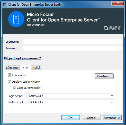 You can specify whether login scripts are run, whether the results are displayed, and whether the login window is automatically closed during login. In addition, if the login script uses the %2, %3, %4, or %5 variables, you can set these variables by clicking the Variables button.