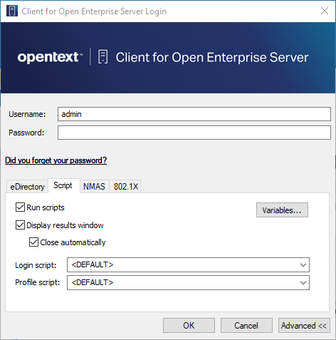 If Advanced Authentication Client is enabled to be used during eDirectory login, when a network login is attempted from the desktop, the Client for Open Enterprise Server presents an additional tab, Advanced, in the eDirectory login dialog. On this tab you can specify the Advanced Authentication user and server information.