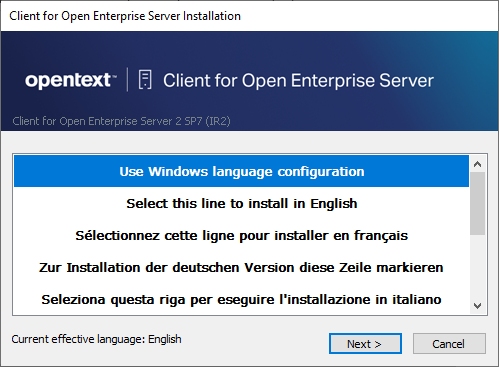 On new installations, the default choice in the language selection dialog box is Use Windows language configuration. The language selection list also includes the other available languages which Client for OES supports (for example, Select this line to install in English and Select this line to install in French).