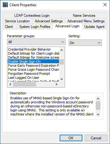 To enable the SSO feature, you must first enable the SSO functionality in the Client Properties. Once enabled, SSO will be attempted during every login to both eDirectory and Windows. Note that the Client SSO functionality is only available in cases where an eDirectory login is being performed in addition to the Windows account login.