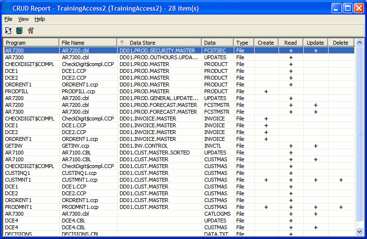 The CRUD Report for a project shows the data operations each program in the project performs, and the data objects on which the programs operate. To generate a CRUD Report, select a project in the Repository Browser and choose Prepare > CRUD Report. The figure below shows a CRUD Report.