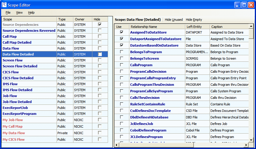 Use the Scope Editor to manage the scopes in your repository, create custom composite relationships, and define relationship filters. To open the Scope Editor, choose Scope > Scope Editor. The Scope Editor opens, with the workspace scopes listed in the lefthand pane and their relationships in the righthand pane. The figure below shows the Scope Editor.