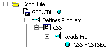 The relationships between objects describe the ways in which they interact. In the figure, the source file GSS.CBL defines the GSS program. The program, in turn, reads the data file GSS.FCSTSEC.