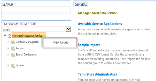 1. In the left-hand navigation pane, click Managed Metadata Service root drop-down menu and choose New Group.