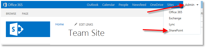 1. Login to your Office 365/SharePoint Online portal, as a tenant administrator, and click on the Admin > SharePoint menu item.
