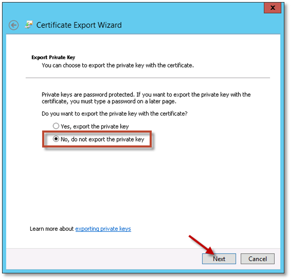 6. Select “No, do not export the private key” and click Next.