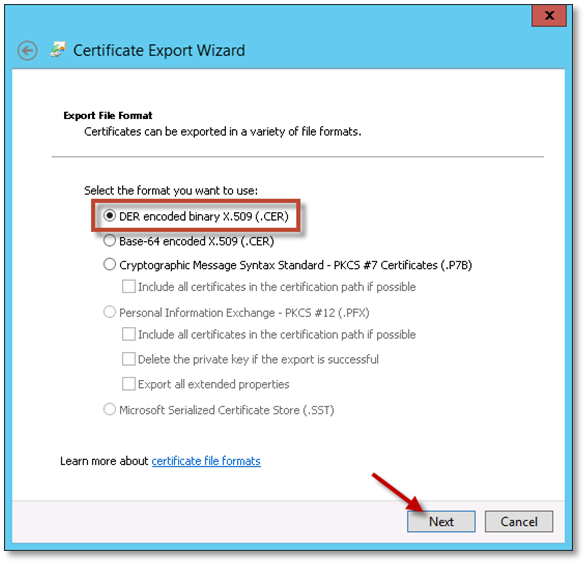 7. Select to export as “DER encode binary X.509”, and click Next.