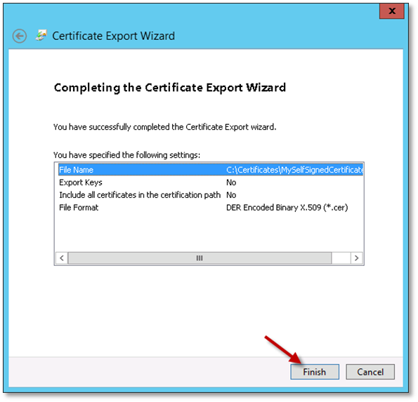 8. Specify the full file path to export the “.cer” file too, and click Next.