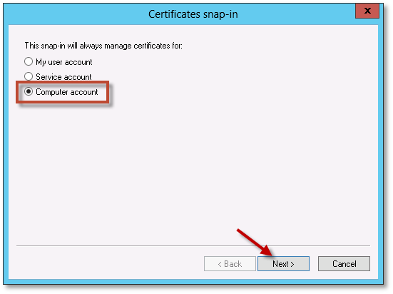 5. On the Certificates snap-in dialog, select Computer account and click Next.