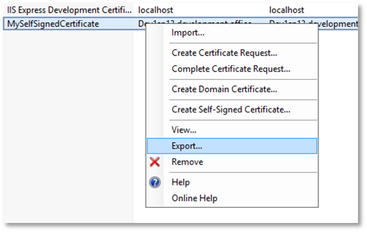 6. Right-click the certificate in the list, and then select Export.