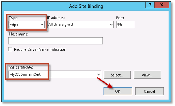 4. On the Add Site Binding dialog, change the Type to https and then select your certificate in the SSL certificate drop-down. Click OK.