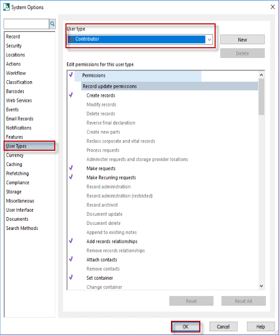 Select the User Types tab.  Select the User Type to be modified then add or remove the permissions to build the required default permission set for that type of user. Click OK to save these settings.