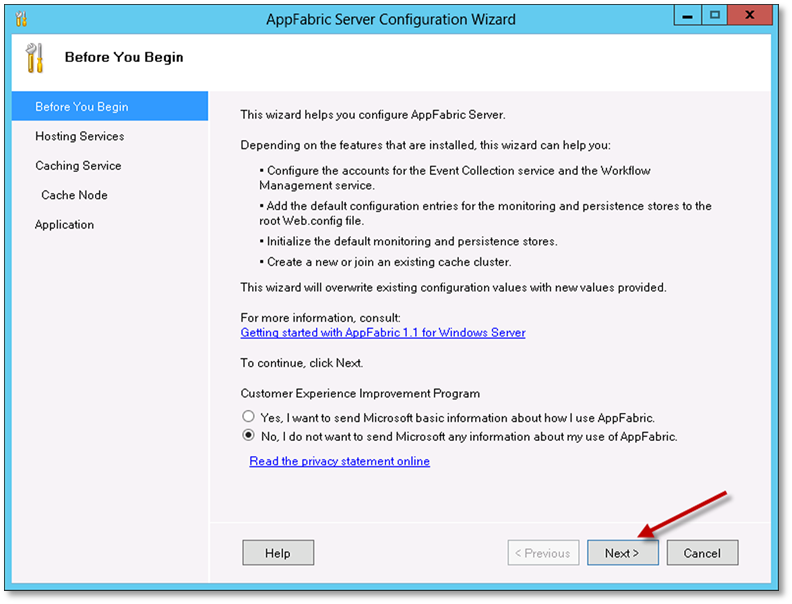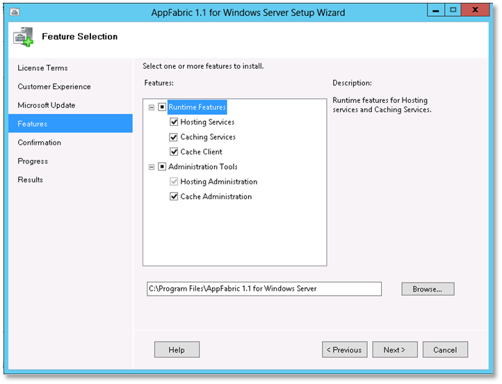 Complete the rest of the wizard with default settings to install AppFabric.