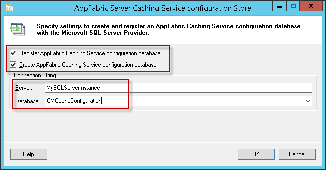 Fill in your SQL Server name and provide a name for the caching configuration store database. The example given is ‘CMCacheConfiguration’, but you can use any name you deem appropriate. This will create a new database in SQL Server. Click OK.